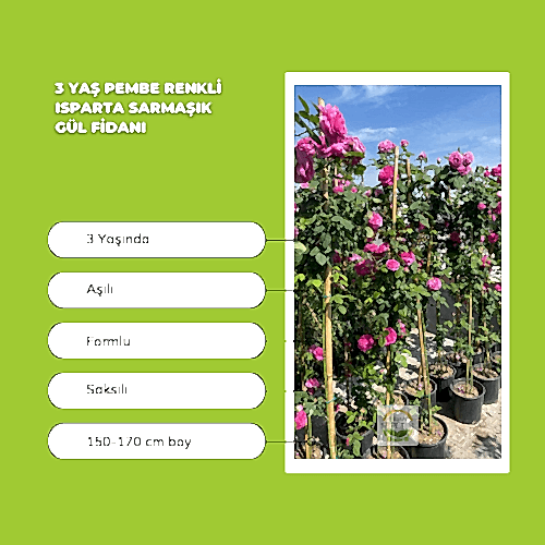 Bitki Cins/Çeşit Özellikleri2 Adet 3 Yaş Pembe Renkli Isparta Sarmaşık Gül Fidanı Paketi Goncaları pembe renkli ve kokuludur.